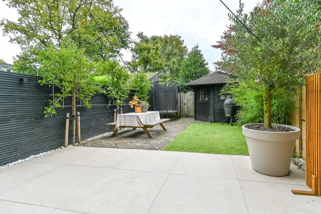 De ruime voortuin en de 10 meter diepe achtertuin zijn beide voorzien van sierbestrating met onder andere originele waaltjes. De zonnige en vrije achtertuin heeft een schuur met elektra en een achterom.