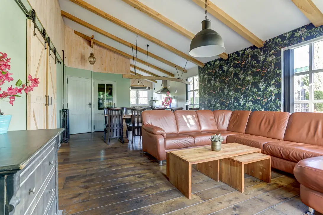 De woning straalt ruimte en karakter uit dankzij de hoge plafonds en de robuuste houten spanten in de woonkamer. De openslaande deuren naar het terras zorgen voor een natuurlijke overgang tussen binnen en buiten, waardoor het buitenleven altijd dichtbij is. De moderne open keuken is van alle gemakken voorzien, met diverse inbouwapparatuur zoals een koel-vriescombinatie, vaatwasser, kookplaat met afzuigkap en oven.