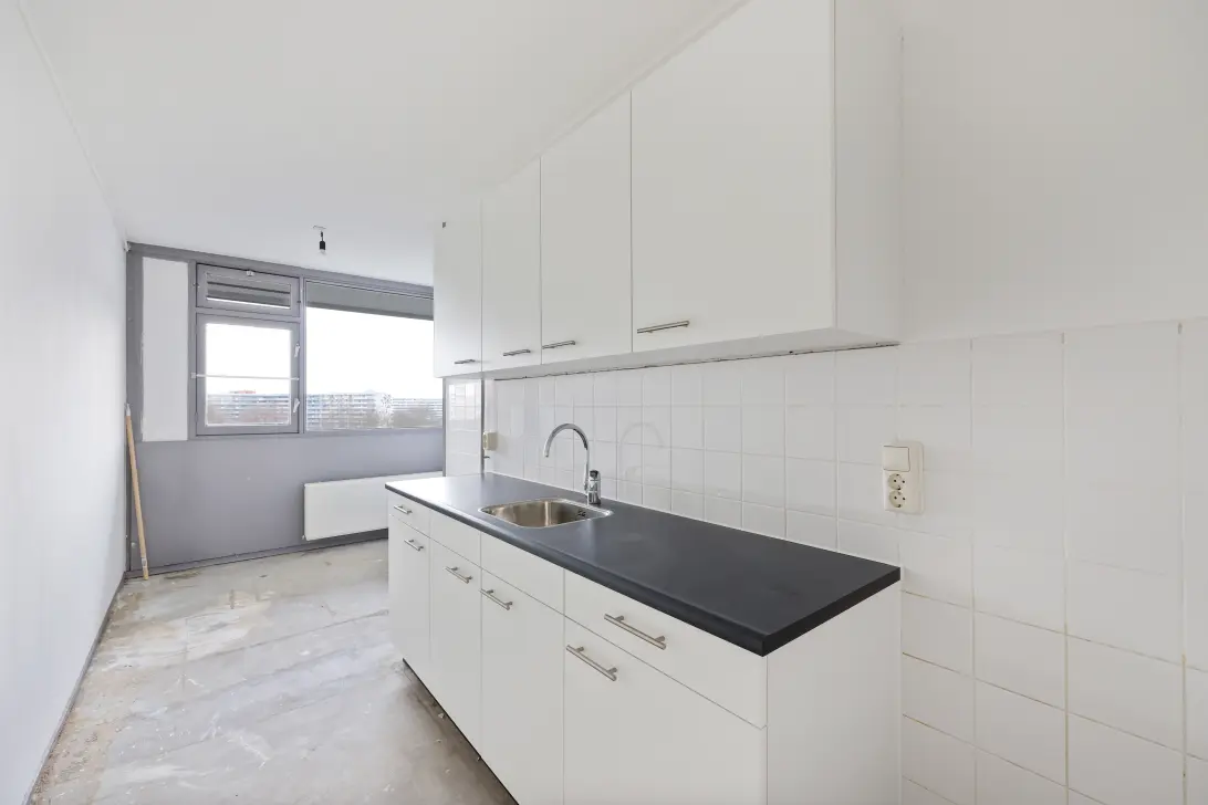 Via the communal stairwell you take the elevator to the seventh floor, after which you reach the apartment via a shared gallery. Upon entering, you step into a hallway that provides access to the meter cupboard, the kitchen, and the rest of the apartment. At the front of the property is the first generously sized bedroom, as well as the kitchen, which can still be finished to your own taste and offers sufficient space to create a dining area. At the rear you will find the spacious living room, which provides access to the 14.3 m² balcony running across the full width of the apartment and facing south.