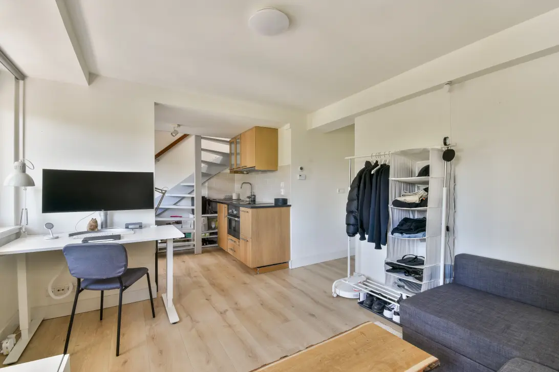 De tweede woning is eveneens slim en compact ingedeeld en heeft toegang middels openslaande deuren tot een balkon op het Noorden welke een open uitzicht geniet. Ook hier is een open keuken gecreëerd met een oven, vaatwasser en inductie kookplaat. Middels de interne trap bereikt u de slaapkamer in de nok.