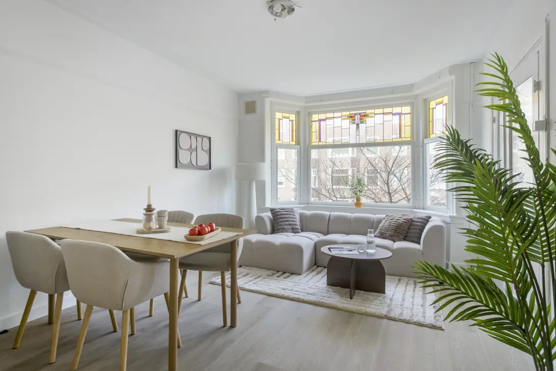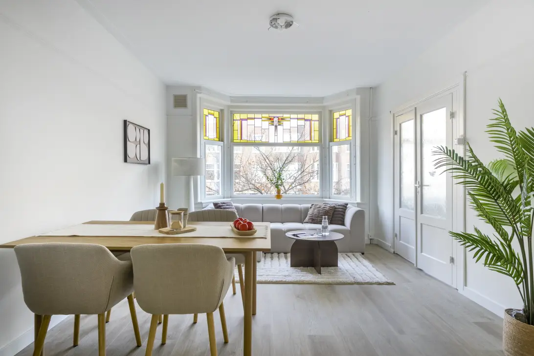 This charming and bright two-bedroom apartment (three rooms in total) is located on the first floor of a beautiful 1930s building. The home exudes character thanks to its many authentic details, including the stunning bay window with stained glass at the front. Here, you live comfortably on a quiet and wide street in the heart of Amsterdam’s popular Rivierenbuurt district.