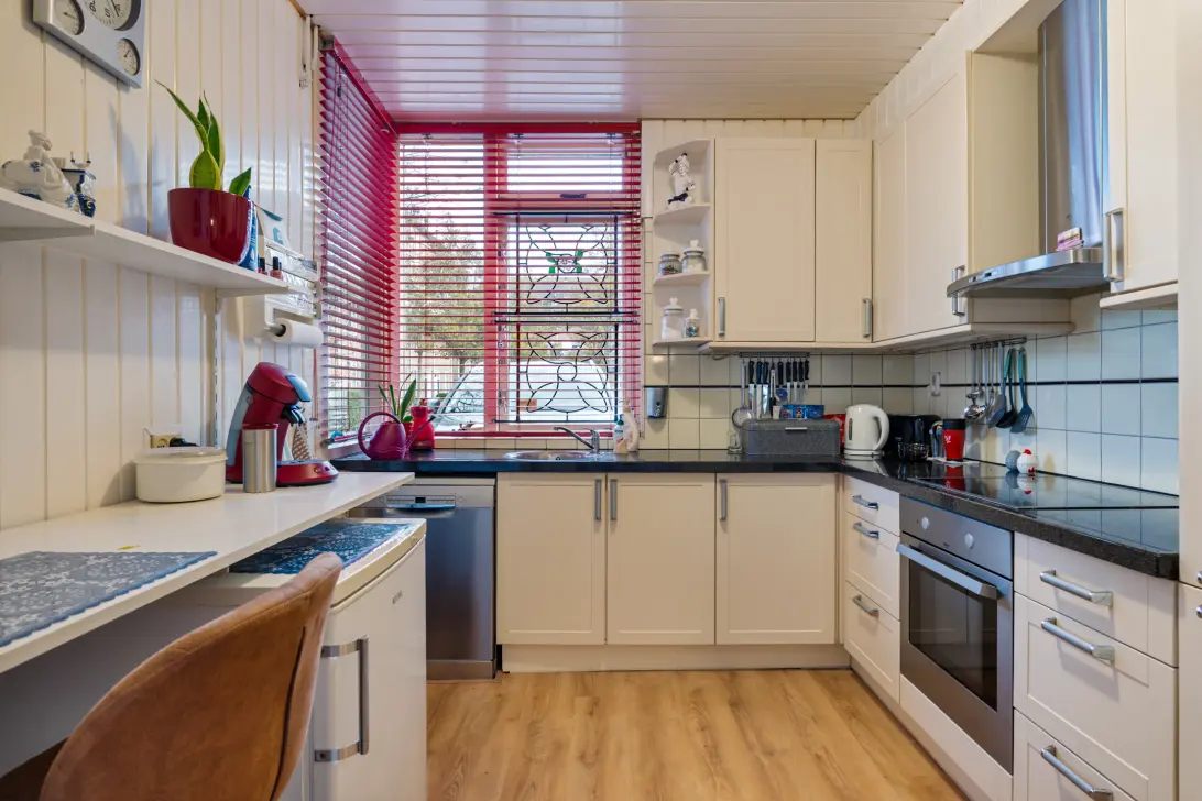 De keuken bevindt zich aan de voorzijde en is uitgevoerd in een praktische, dichte opstelling. Deze is uitgerust met diverse inbouwapparatuur, waaronder een vaatwasser, oven, inductiekookplaat en koelkast. De tuin rondom is onderhoudsvriendelijk aangelegd, met als absolute pluspunt de extra brede zijtuin — een perfecte plek voor een loungehoek, speelruimte of groenliefhebbers.