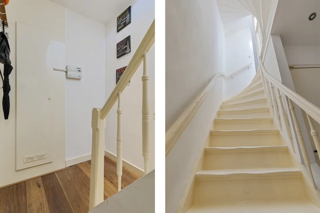 Entrance of the apartment in the stairwell on the third floor, hall, meter cupboard, internal staircase to the fourth floor, landing, at the back the spacious living room with open kitchen and access to the terrace/balcony facing west, centrally in the middle the bathroom with bath, separate shower, sink and toilet, built-in cupboard for the washing machine and central heating boiler and at the front of the house two bedrooms, the largest of which has a dormer window and built-in cupboard, via a fixed/solid staircase you reach the spacious roof terrace above (approx. 6.85 x 4.50 meters). The steel supporting structure of the terrace is in excellent condition, the wooden floor and the fencing must be replaced immediately (but this has been taken into account in the asking price).