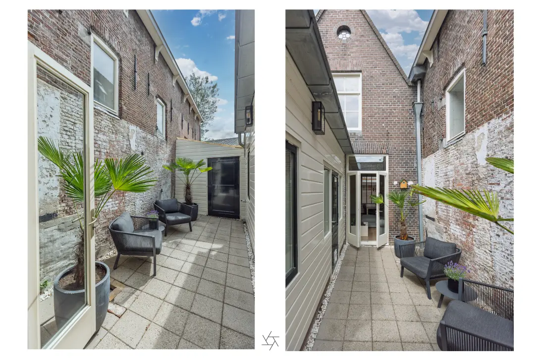 Aan de achterzijde beschikt de woning over een zonnige patio op het zuiden, een heerlijke plek om in alle rust te ontspannen. Extra bijzonder is dat deze patio grenst aan één van de oudste archeologische muren van Weesp – een uniek stukje historie in je eigen achtertuin. Daarnaast is er een praktische berging aanwezig.