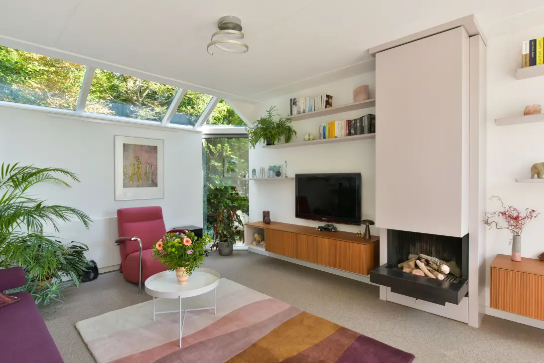 De woonkamer is royaal en stijlvol met een strakke structuurverfafwerking, vernieuwde woongrindvloer met vloerverwarming en een gezellige gashaard. Wil je liever een houtkachel? Ook dat is hier te realiseren. Grote raampartijen zorgen voor veel licht en een prachtig uitzicht over het groen en het water. Vanuit de bijkeuken heb je toegang tot een aangebouwde berging en ben je zo bij je auto die je makkelijk onder de carport parkeert.