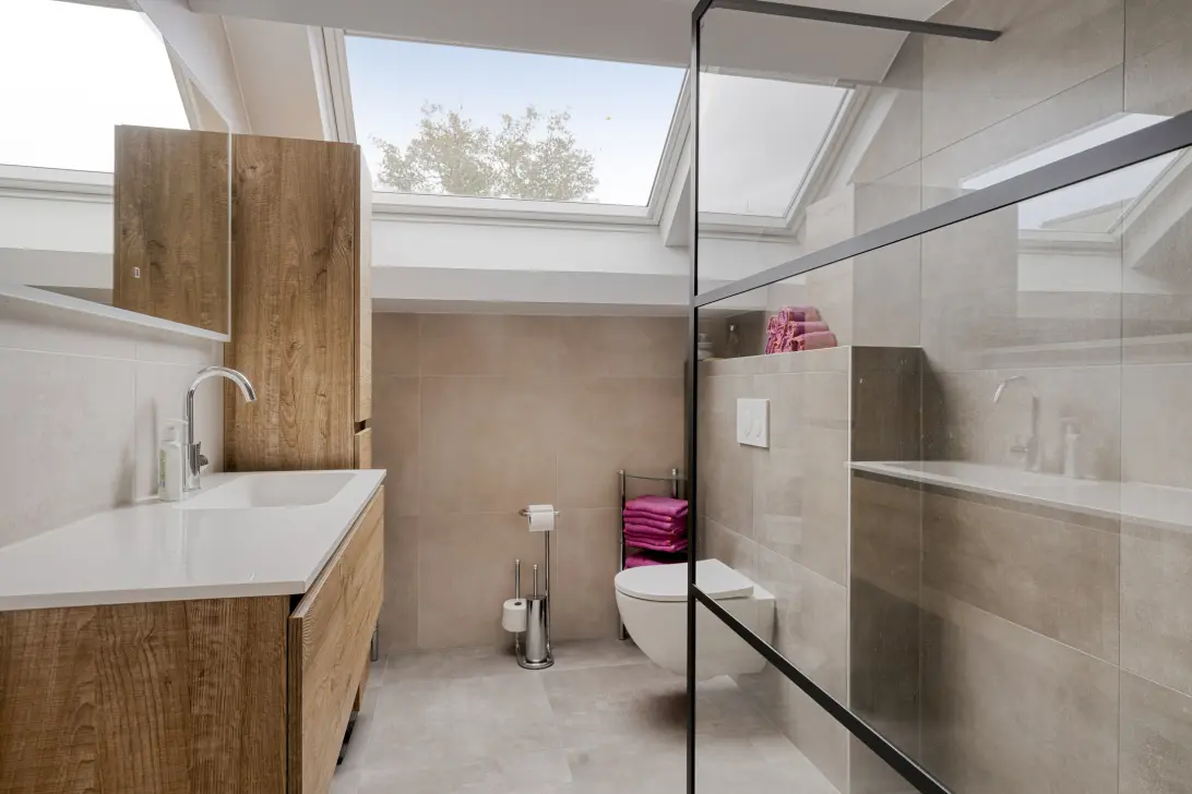 De eerste verdieping beschikt over twee slaapkamers, waarbij de slaapkamer aan de voorzijde is voorzien van een dakkapel die extra ruimte creëert. De moderne, stijlvolle badkamer is uitgerust met een ruime inloopdouche, een wastafel, een tweede toilet en een groot dakraam dat zorgt voor veel natuurlijk licht.