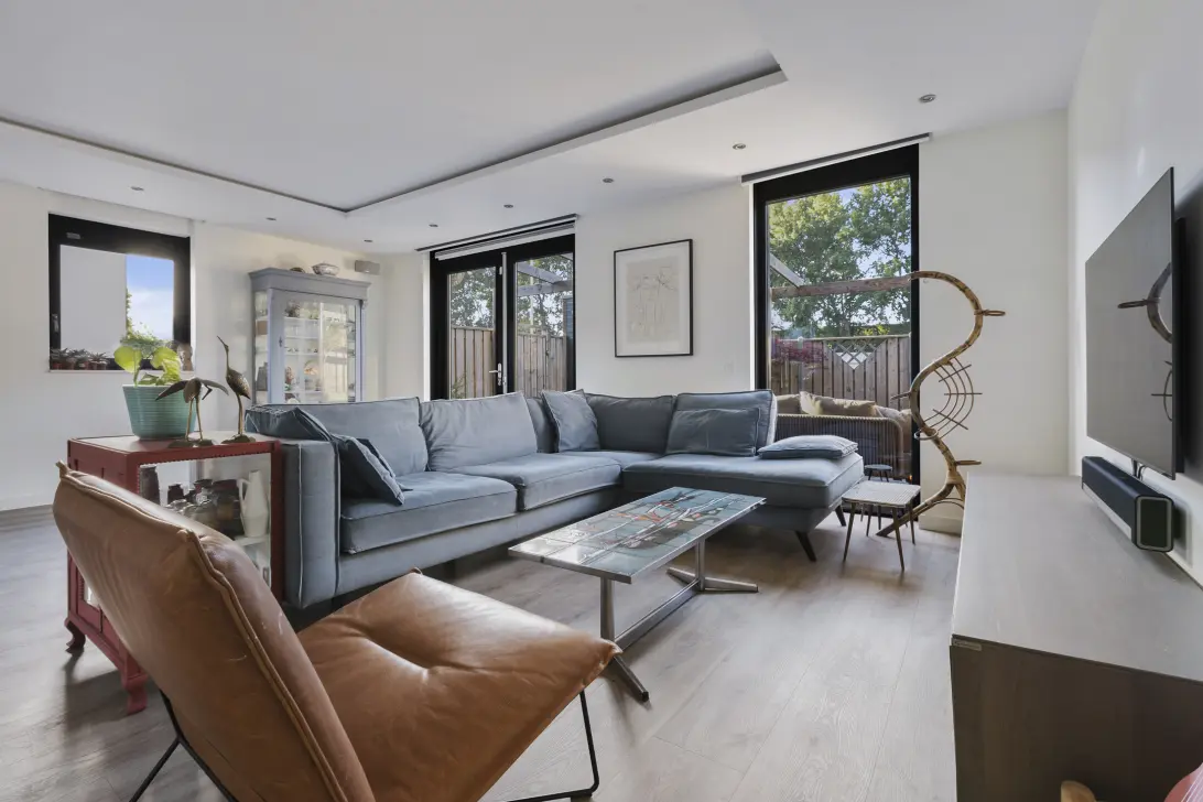 Bij binnenkomst bevindt zich in de hal de meterkast, een modern toilet met fonteintje, de trap naar de eerste verdieping en de toegang tot de woonkamer. De royale woonkamer is heerlijk licht dankzij een extra raam in de zijgevel en openslaande deuren naar de zonnige achtertuin op het zuiden. Aan de voorzijde bevindt zich de luxe Siematic keuken, uitgerust met hoogwaardige inbouwapparatuur, waaronder een Boretti fornuis met dubbele oven en 5-pits kookplaat, een afwasmachine, combi-oven, afzuigkap, wijnklimaatkast, Quooker en een separate koel-/vriescombinatie. Via een schuifpui in de keuken is er directe toegang tot de voortuin.