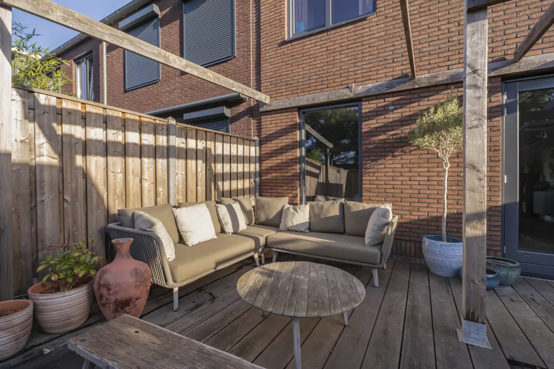 De ruime achtertuin met terras is ideaal gelegen op het zuiden, waardoor u de hele dag van de zon kunt genieten. Achterin de tuin bevindt zich een schuur met elektra en een handige achterom.