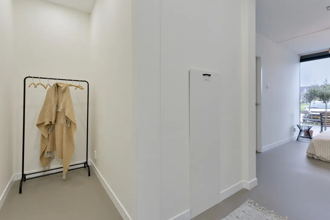 Eigen entree met meterkast en trapopgang en toegang tot de slaap-/werkkamer op de begane grond. Deze ruimte kan ook uitstekend gebruikt worden als een kantoor aan huis.