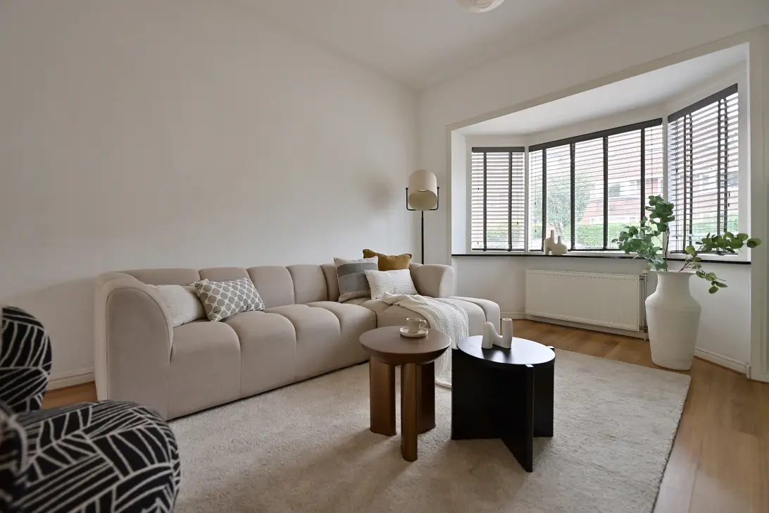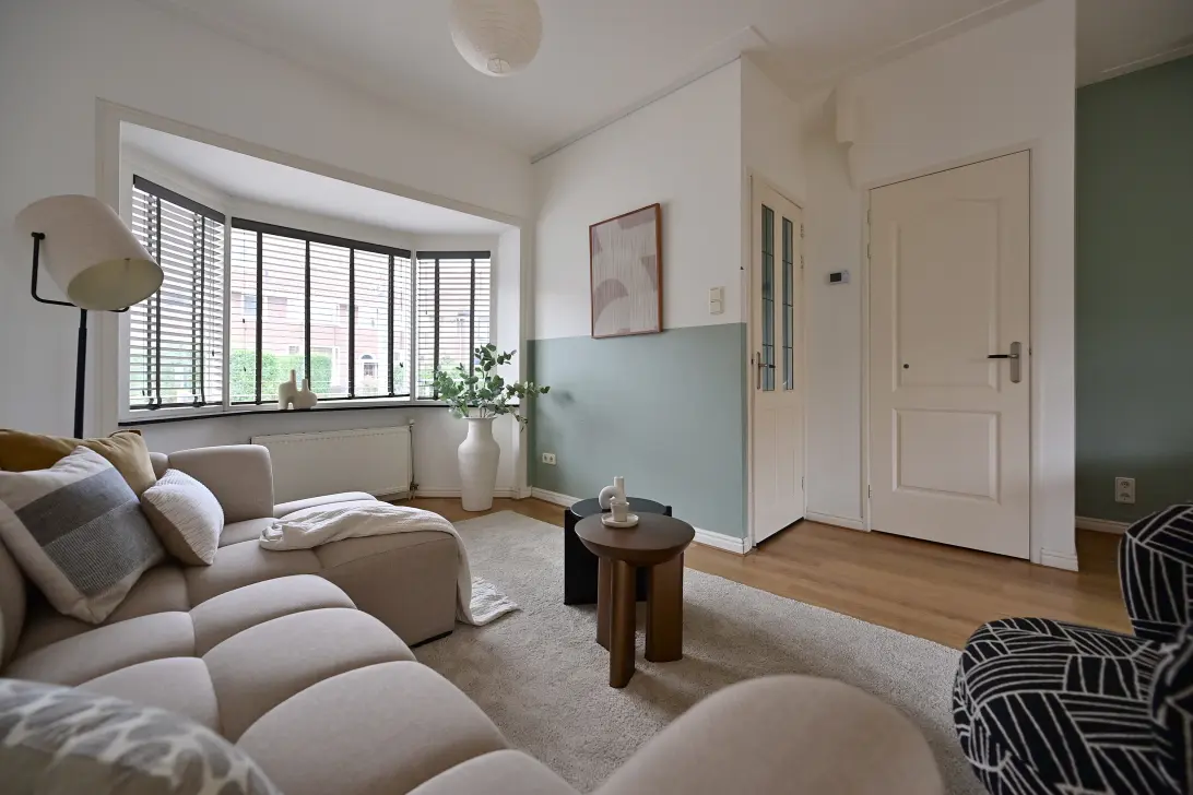 Entree met hal, lichte woonkamer met erker aan de voorzijde en aan de achterzijde openslaande deuren naar de tuin.