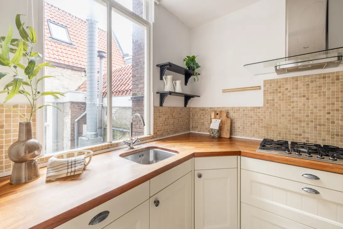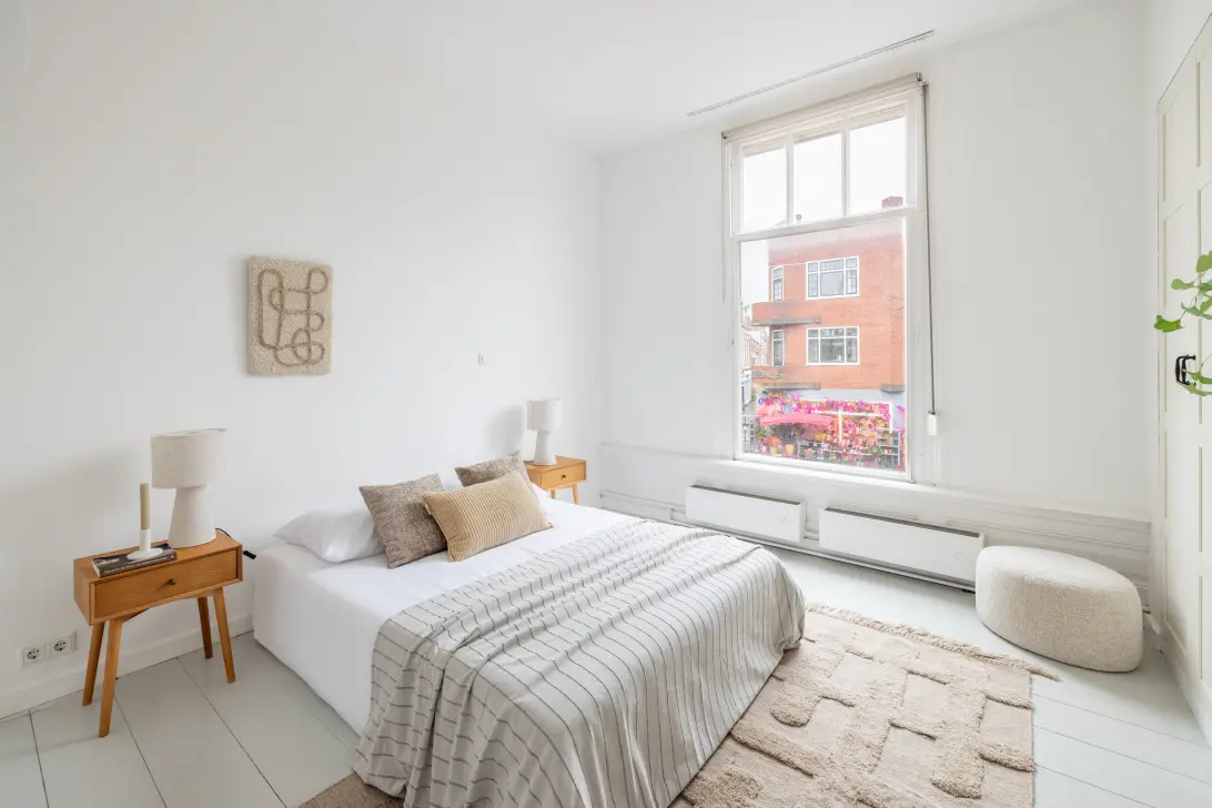 De lichte woonkamer aan de voorzijde met een leuk uitzicht op de levendige straat en een balkon op het zuidwesten. Bij de hal is er een ingebouwde kast en een separaat toilet. Aan de voorzijde van de woning is ook de slaapkamer te vinden met eveneens hoge plafonds. Vanuit de slaapkamer is er toegang tot de moderne badkamer, voorzien van een dubbele wastafel en een inloopdouche. De keuken bevindt zich aan de achterzijde en is voorzien van een 5-pits gasfornuis, afzuigkap, vaatwasser, koel-vriescombinatie en oven. In een vaste kast in de keuken zijn de wasmachine en droger netjes uit het zicht geplaatst. Een mooi authentiek detail is de originele servieskast, die herinnert aan het bouwjaar en extra charme toevoegt.