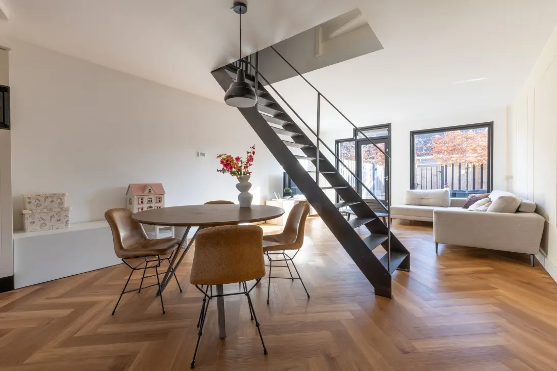 Bij binnenkomst valt direct de vergrote entree op, voorzien van een dakraam voor extra licht. De stijlvolle stalen taatsdeur leidt naar de moderne woonkamer met vloerverwarming en een strakke PVC vloer. De blikvanger van deze ruimte is de stalen trap uit 2020, die het geheel een eigentijdse uitstraling geeft. Aan de voorzijde bevindt zich de keuken, voorzien van diverse inbouwapparatuur.