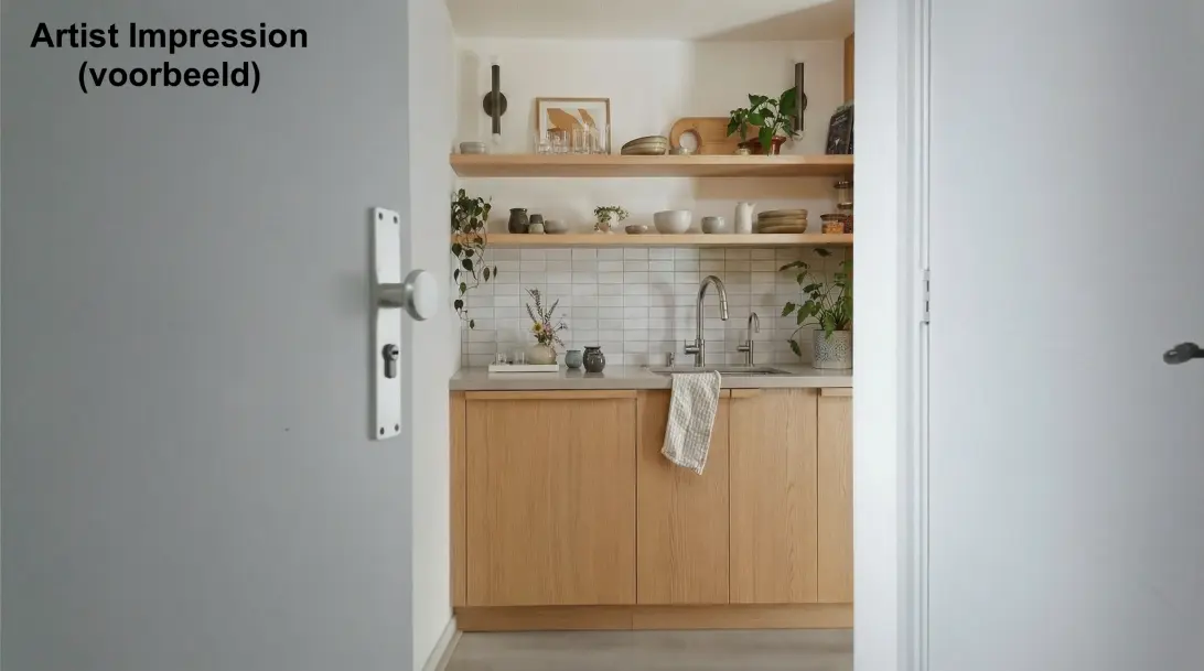 Deze studio op de tweede verdieping gelegen, heeft hoge ramen met veel licht inval en heeft als voordeel ten opzichte van de overige studio's, dat het keuken gedeelte meer is afgescheiden, een grotere entree hal met raam in de achtergevel heeft. Er is een eenvoudig keukenblokje. De badkamer bestaat uit een toilet, wastafel en inloopdouche. We hebben wat animaties/sfeerbeelden toegevoegd ter inspiratie wat je er van kan maken.