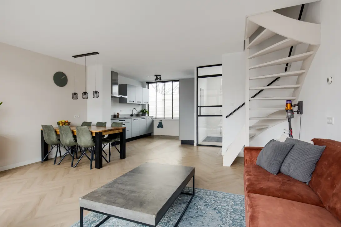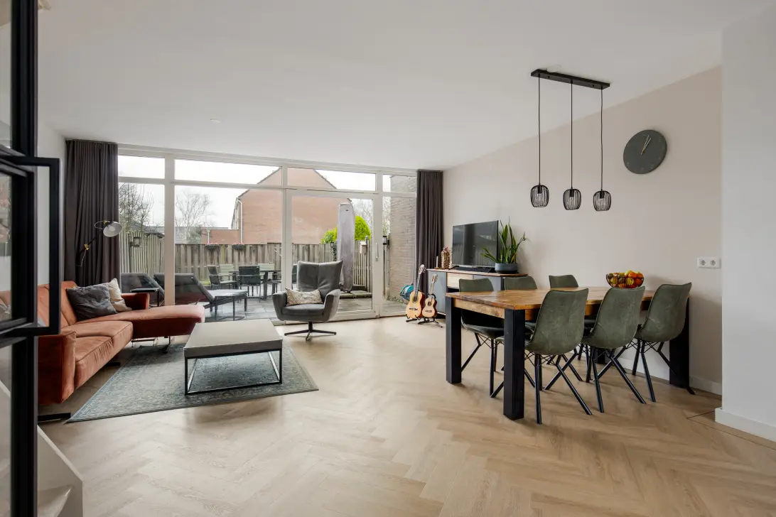 Je stapt binnen en het eerste wat opvalt is de fijne lichtinval. De ruime lichte woonkamer is tuingericht en voorzien van vloerverwarming, PVC vloerafwerking, gestuukte wanden & plafond en kunststof schuifpui met toegang tot de achtertuin.