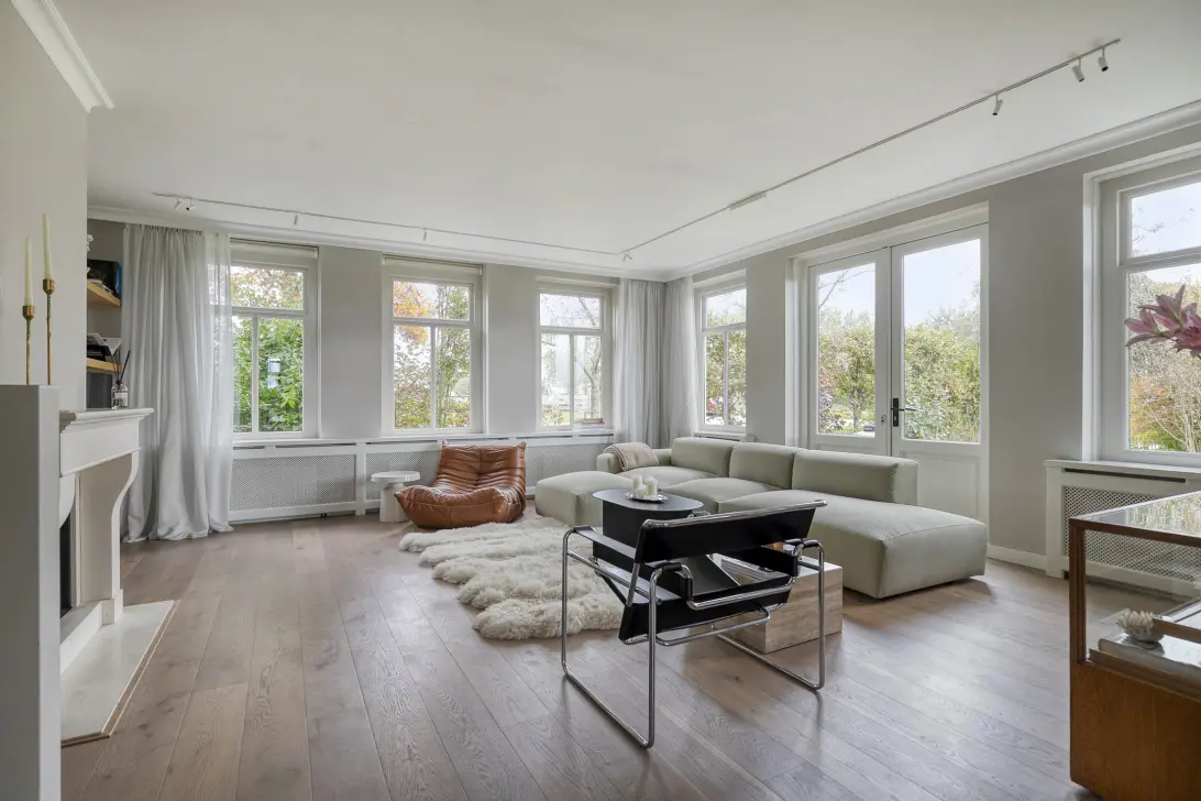 Royale woonkamer: Een uitnodigende leefruimte met een charmante open haard, een statige schouw en grote raampartijen die het buitengevoel naar binnen brengen.