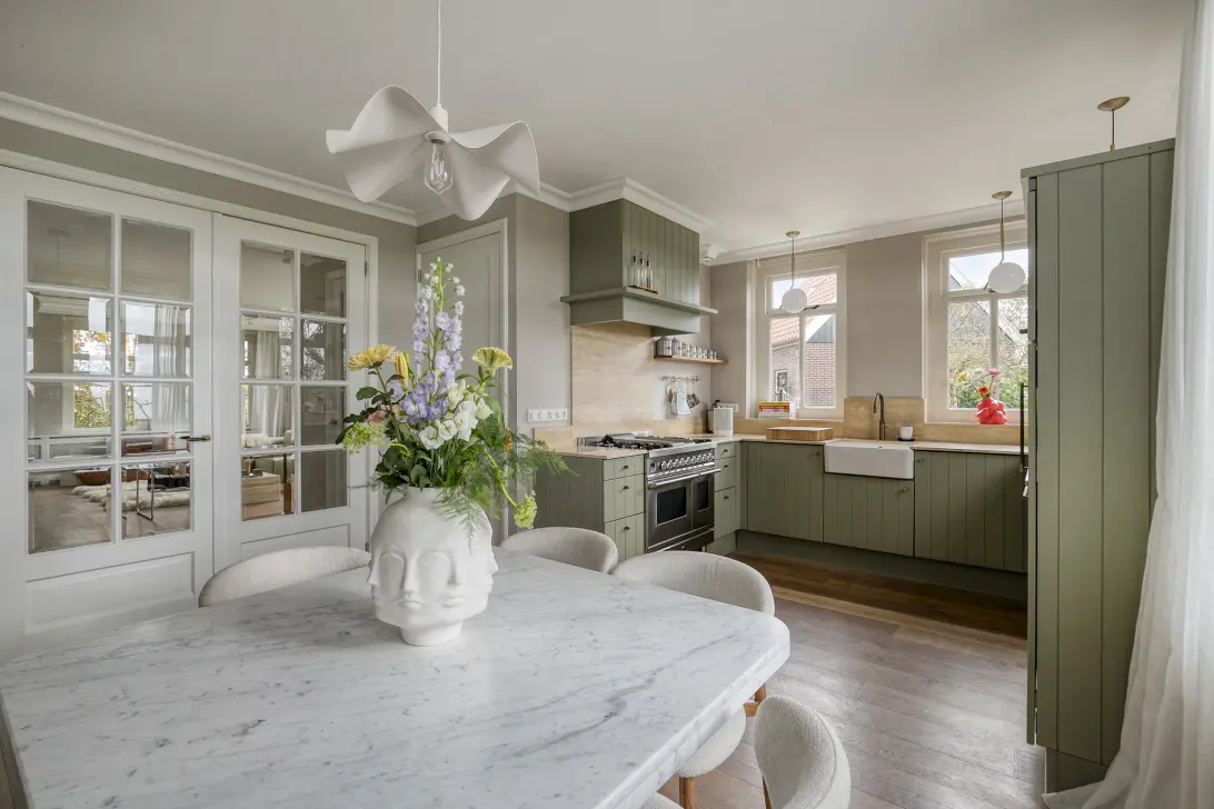 Prachtige woon-/eetkeuken: Het culinaire hart van het huis staat garant voor sfeervolle diners, omlijst met en-suitedeuren die karakter toevoegen. De keuken in luxe U-opstelling met luxe Travertin blad, Boretti fornuis, afzuigkap, koel/vrieskast, vaatwasmachine, Quooker en veel opbergmogelijkheden in de kasten/laden.