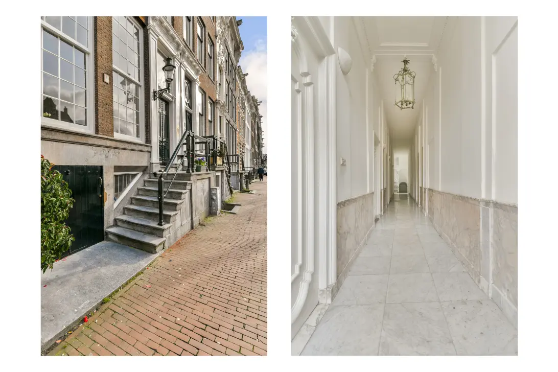 Hoofdentree op de bel-etage met bordes, statige hal met originele marmeren vloer en marmeren lambrisering. Gemeenschappelijk trappenhuis, de voordeur van het appartement bevindt zich op de tweede verdieping. Deze verdieping beschikt over een open keuken die grenst aan de woon- en eetkamer die is voorzien van een mooie houten vloer en origineel balkenplafond. De woonkamer biedt uitzicht over de prachtige binnentuinen. Via de trap komt u op derde verdieping. Deze heeft twee kamers met inbouwkasten, waarvan een kamer met openslaande deuren toegang geeft tot het terras waar u heerlijk kunt genieten van de buitenlucht. De badkamer is voorzien wastafelmeubel, bad met douche en aansluiting voor de wasmachine. Met een trap komt u op de zolderruimte, die gebruikt kan worden als extra opbergruimte of logeerkamer.