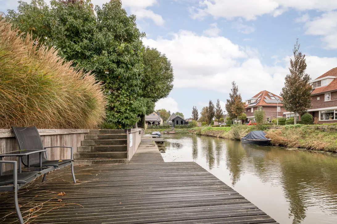 De tuin is keurig aangelegd en voorzien van meerdere terrassen, beplanting, bomen en gras. Aan de achterzijde treft u een ruim terras en een trappetje naar het vlonderterras aan het brede vaarwater. Ook heeft u een terras op het zonnige westen. Hier kunt u tot laat in de avond heerlijk genieten van de zon en heeft u volop privacy.