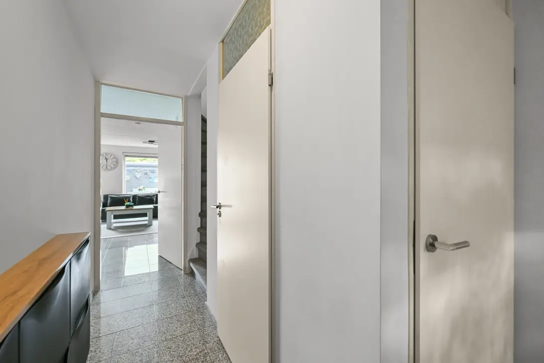 Through the entrance, you enter the spacious hallway which gives access to the meter cupboard and a separate toilet with a small sink. From the hallway, you can access both the kitchen at the front and the living room at the rear. The spacious living room features a granite floor with comfortable underfloor heating and has French doors leading to the sunny east-facing garden. The garden includes a shed with electricity, water supply, and a back entrance. The modern kitchen at the front is equipped with various built-in appliances, including a dishwasher, 4-burner gas stove, oven, and extractor fan. There is a practical storage cupboard under the stairs.