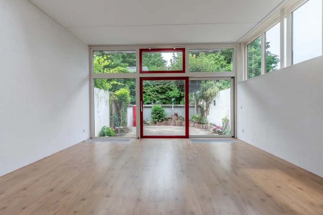 Via de entree komt u in de hal met garderobe en toilet. De ruime woonkamer is heerlijk licht dankzij de brede schuifpui en de grote kozijnen. Zodra u de tuindeuren opent, grenst de woning direct aan het achtergelegen park – een unieke plek waar binnen en buiten naadloos in elkaar overlopen. De achtertuin ligt gunstig op het zuidwesten, waardoor u bijna de hele dag zon heeft. Aan de achterzijde van de tuin bevindt zich een ruime berging (beton) en er is een achterom.