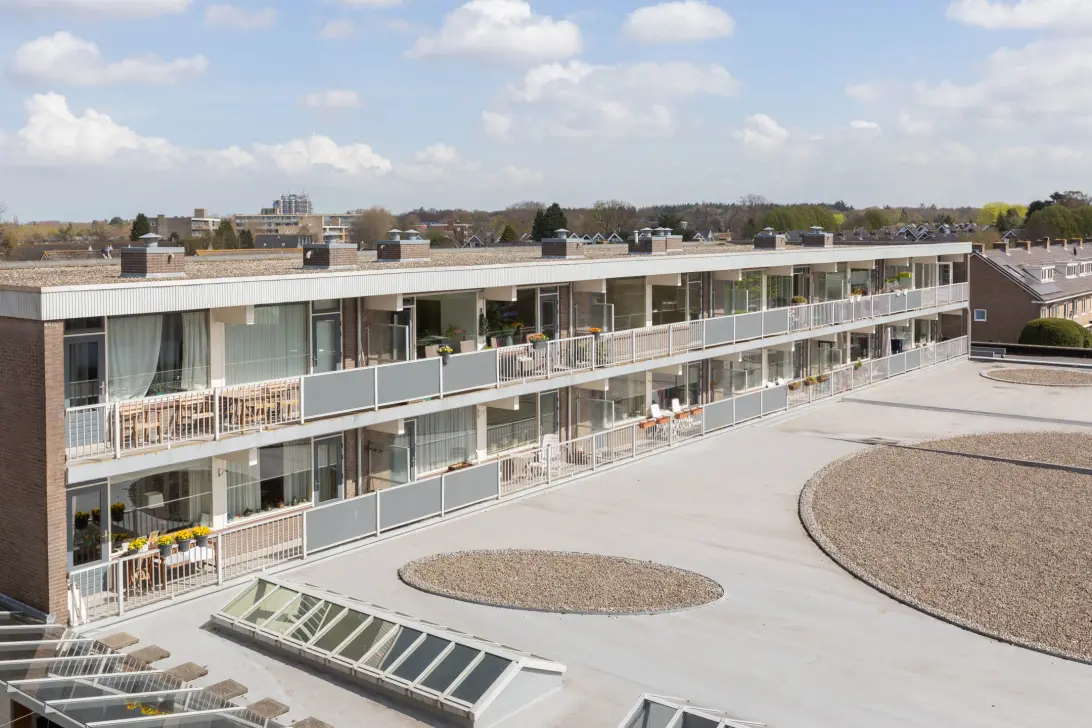 Entree/vestibule, gang met meterkast (gasloos) en intercom, modern toilet met fonteintje, ruime woonkeuken met plek voor een tafel, het moderne keukenblok is in hoekopstelling geplaatst en voorzien van de denkbare inbouwapparatuur. De lichte en ruime woonkamer heeft toegang tot het grote balkon dat over de gehele breedte van het appartement is gesitueerd en vrij uitzicht heeft. De aansluitende hoofdslaapkamer heeft eveneens een deur naar het balkon, ook is er toegang tot de moderne badkamer met wastafelmeubel en inloop(regen)douche. De 2e slaapkamers bevinden zich aan de "koele" zijde van het gebouw met tussen beide kamers in een separaat halletje met toegang tot de badkamer en voorzien van wasmachine-/droger aansluiting, hier kan tevens de stofzuiger en de strijkplank netjes uit het zicht worden opgeborgen.