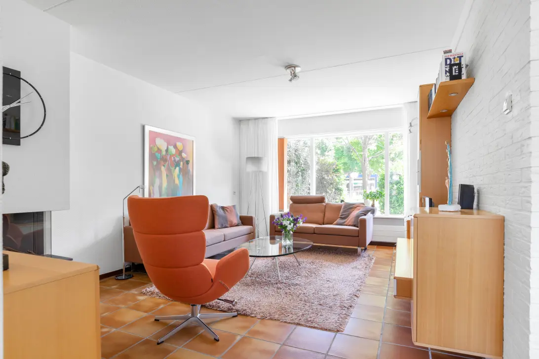 Bij binnenkomst valt direct de uitnodigende sfeer van de woonkamer op. De woonkamer heeft voldoende ruimte voor een comfortabele zithoek, waar je onder andere ook de haard kan aanzetten wanneer het buiten koud is.