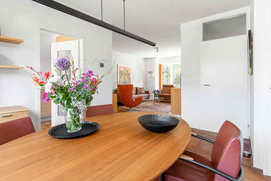 Aan de achterzijde van de woning bevinden zich de eethoek en gesloten keuken. De keuken, direct grenzend aan het eetgedeelte, is praktisch ingericht en van alle gemakken voorzien. De keuken biedt tevens de toegang tot de tuin.