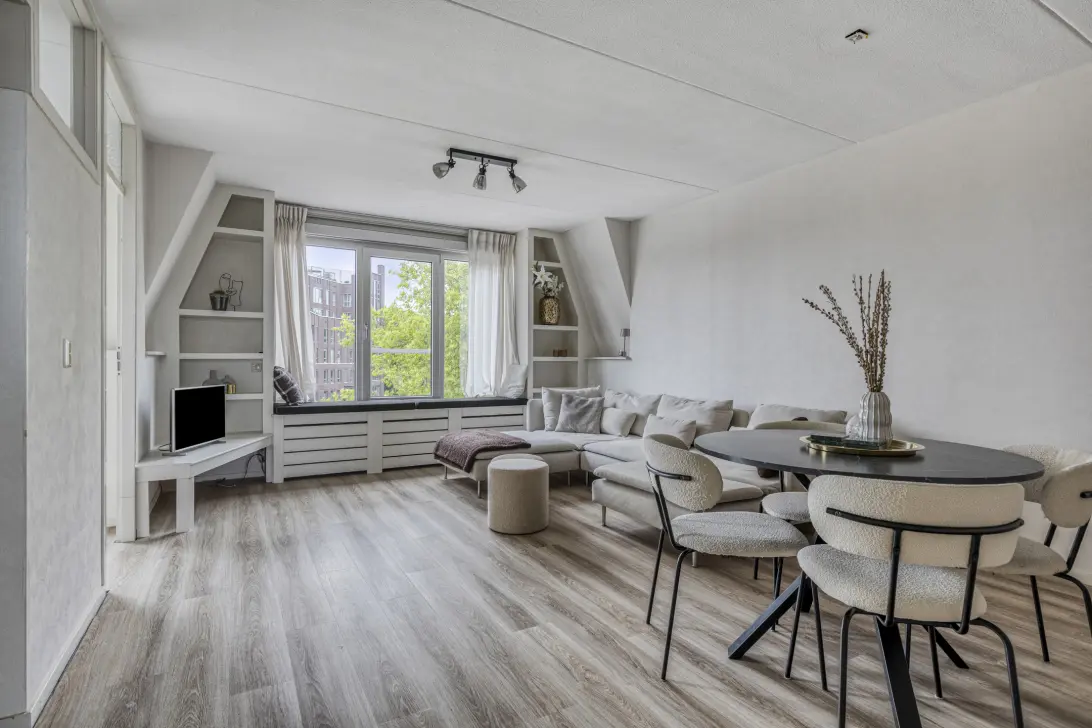 Dit charmante appartement, gelegen met uitzicht over de pittoreske Plantsoengracht en het gezellige Looiersplein, bevindt zich aan het begin van de levendige Koemarkt, bekend om haar bekroonde terrasjes. Met een oppervlakte van 58 m² biedt dit appartement een aantrekkelijke combinatie van comfort en stijl. Het is gelegen op de bovenste verdieping van het complex en heeft aan de voorzijde iets schuin weglopende wanden hetgeen het geheel meer cachet geeft dan de lager gelegen appartementen.
