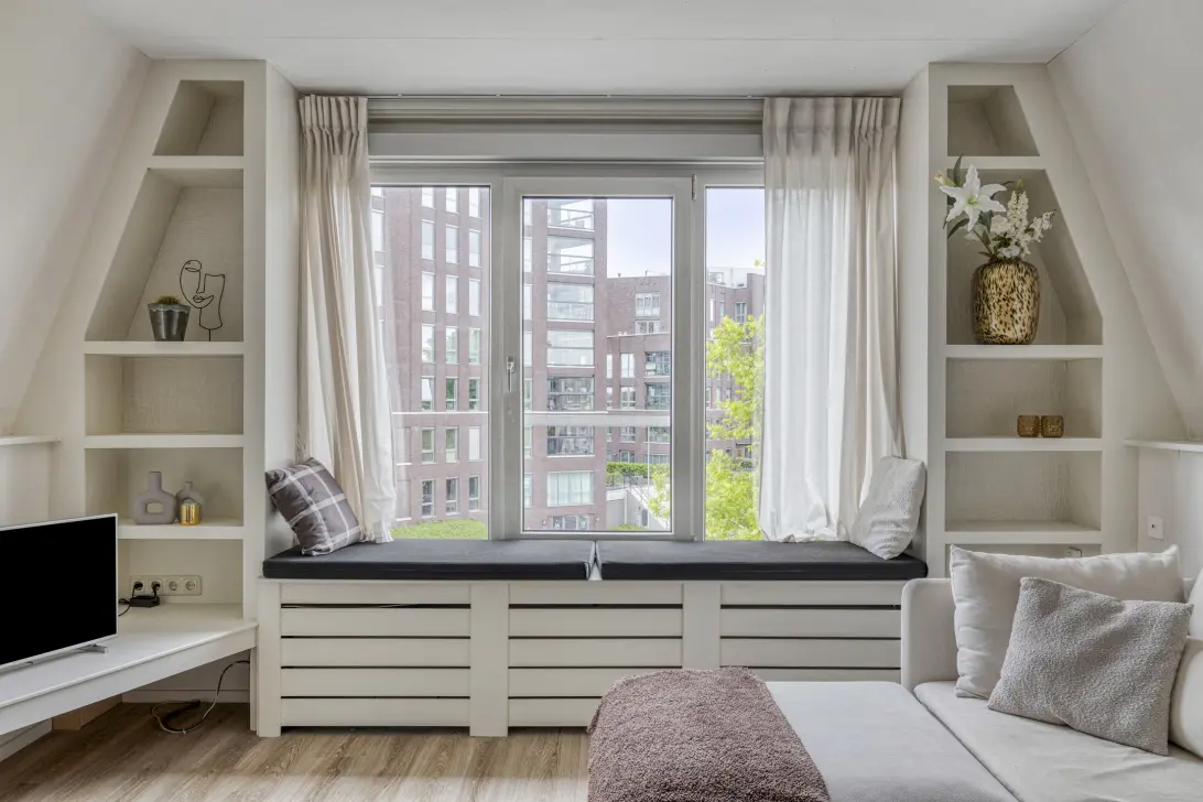 Bij binnenkomst in het appartement kom je in de ruime hal die toegang biedt tot de verschillende vertrekken. De lichte woonkamer heeft grote raampartijen die zorgen voor een aangename lichtinval en een gevoel van ruimte. Om de raampartij is een fraaie kast gebouwd en een extra brede vensterbank waar je heerlijk in kunt zitten en van het leuke uitzicht kunt genieten. De moderne open keuken is voorzien van alle gemakken, zoals een vaatwasser, koelkast, magnetron, vaatwasser, oven, fornuis en afzuigkap. Vanuit de woonkamer bereik je via een schuifpui het balkon waar je heerlijk kunt genieten van de buitenlucht.