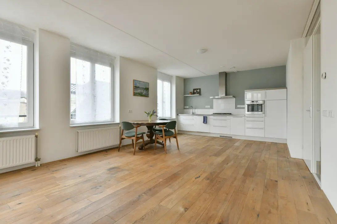 De hal en woonkamer zijn voorzien van eikenhouten vloerdelen; in de slaapkamer ligt een nette laminaatvloer.
