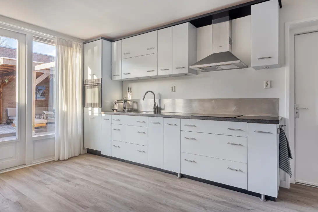 De open keuken met natuurstenen aanrechtblad grenst aan de woonkamer. Door de ruimte is er plek genoeg voor een grote eettafel, een fijne plek om gezellig te tafelen. Dankzij de openslaande deuren naar de tuin valt er bovendien volop natuurlijk licht naar binnen.