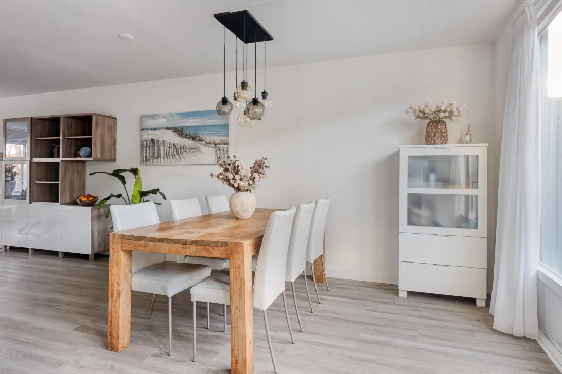 De woonkamer is in 2024 voorzien van een nieuwe PVC-vloer. Dankzij de grote raampartijen valt er volop daglicht binnen, wat de knusse sfeer rondom de houtkachel versterkt. De vloerverwarming zorgt daarbij voor optimaal comfort.