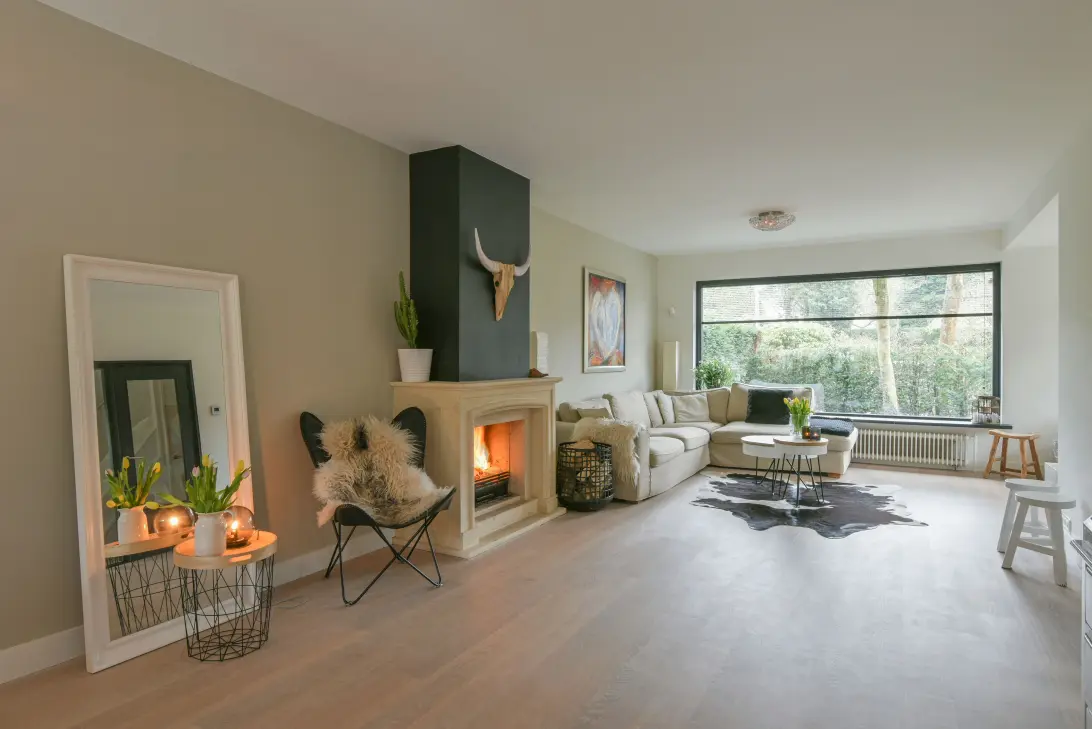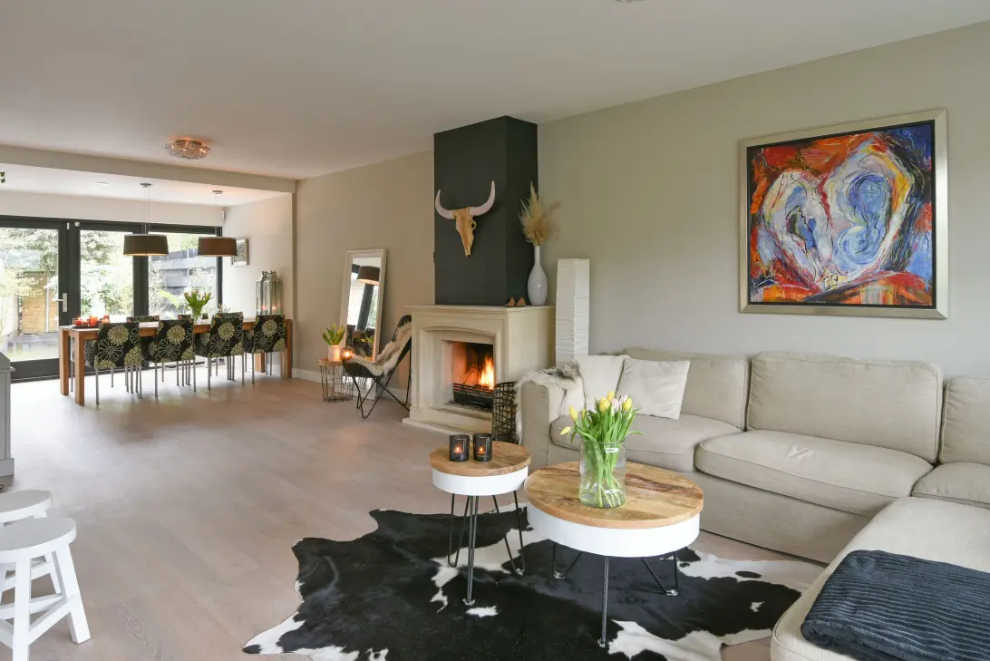 De uitgebouwde woonkamer in L-vorm, voorzien van een massief eikenhouten vloer, een open haard en openslaande deuren naar de op het zuidoosten gelegen achtertuin, is heerlijk licht dankzij grote raampartijen met vrij uitzicht en biedt veel privacy.