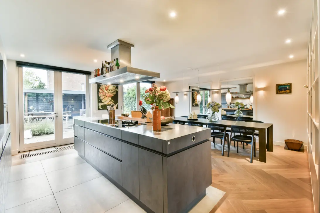 De luxe open keuken (2017) met een zeer groot kookeiland voorzien van grote bar is zeer compleet uitgerust. De keuken is voorzien van hoogwaardige inbouwapparatuur, waaronder een inductiekookplaat, 1 wok brander, combi-oven, stoomoven, bordenwarmer, 2 vriezers, 2 koelkasten, eilandafzuigkap, vaatwasser, Quooker en wijnklimaatkast. De woonkeuken is voorzien van een fraaie inbouwkastenwand.