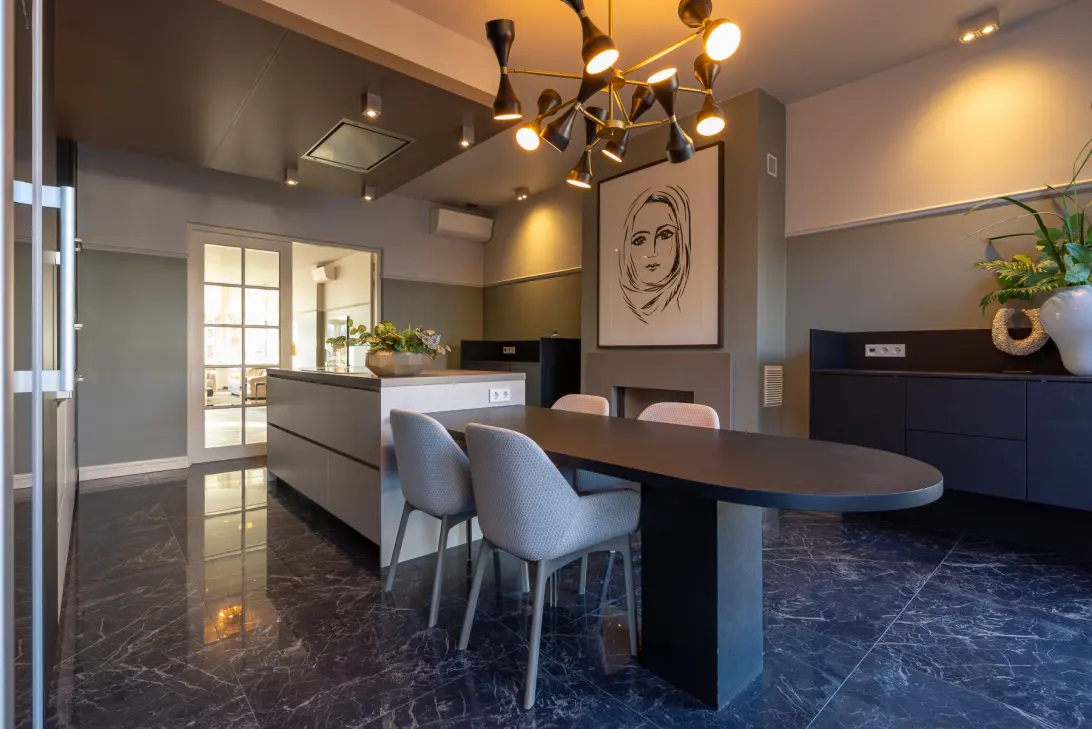 De imposante woonkeuken vormt een sfeervol hart van de woning en beschikt over een tweede open haard, toegang tot het tweede balkon en een hoogwaardige keukenopstelling met onder meer een stoomoven en een grote wijnklimaatkast.