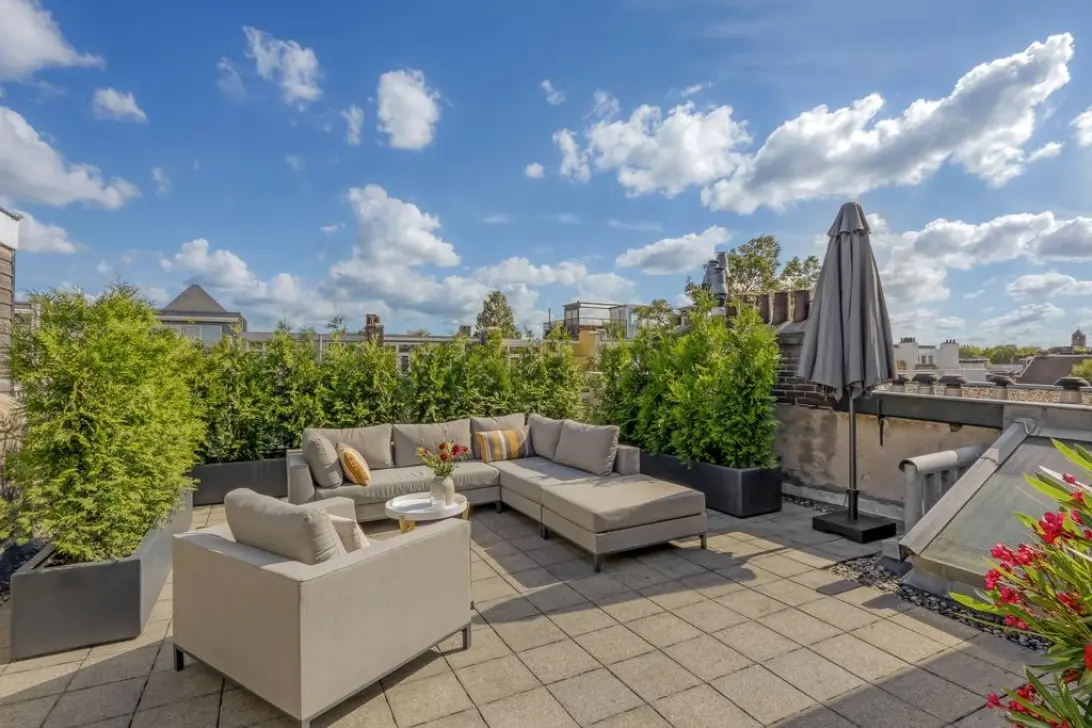 Het dakterras is uitzonderlijk ruim, beschut en voelt als een groene oase midden in de stad. Hier geniet je in alle rust van zon, privacy en uitzicht. Bovendien bestaat de mogelijkheid om een deel te bebouwen voor een extra kamer met badkamer.