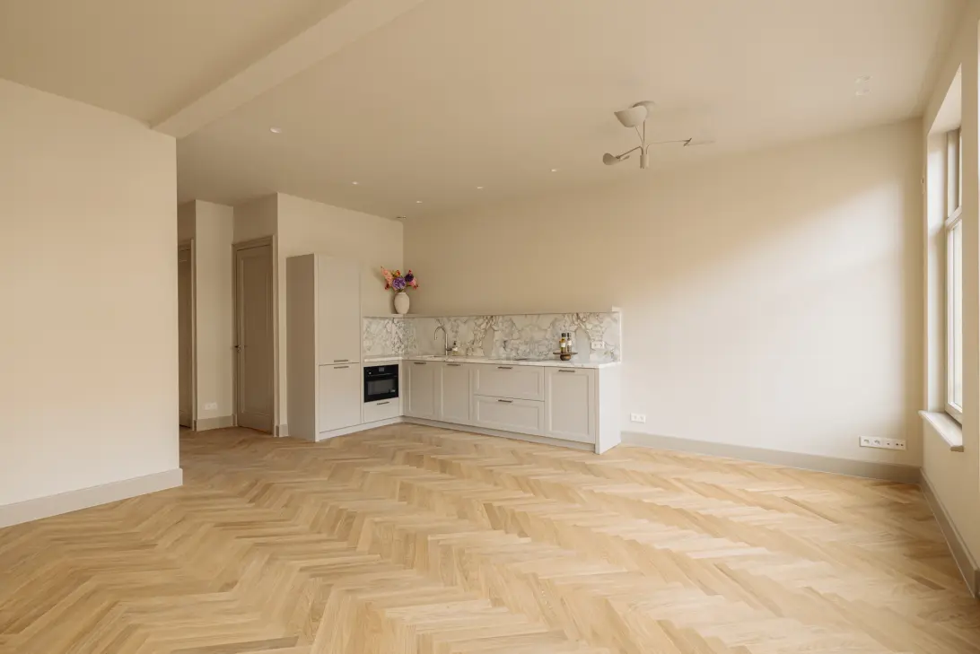 Through a well-maintained and fully renovated stairwell, you reach the apartment on the second floor. The hallway provides access to all rooms of the property. At the front, you’ll find the bright living room with an open kitchen. The luxurious kitchen is equipped with all necessary built-in appliances, including a dishwasher, refrigerator, freezer, oven, induction cooktop with integrated extraction system (all by AEG), a Quooker tap, and a stunning Italian Calacatta Gold marble countertop. The living room features French doors opening onto a charming small balcony at the front.