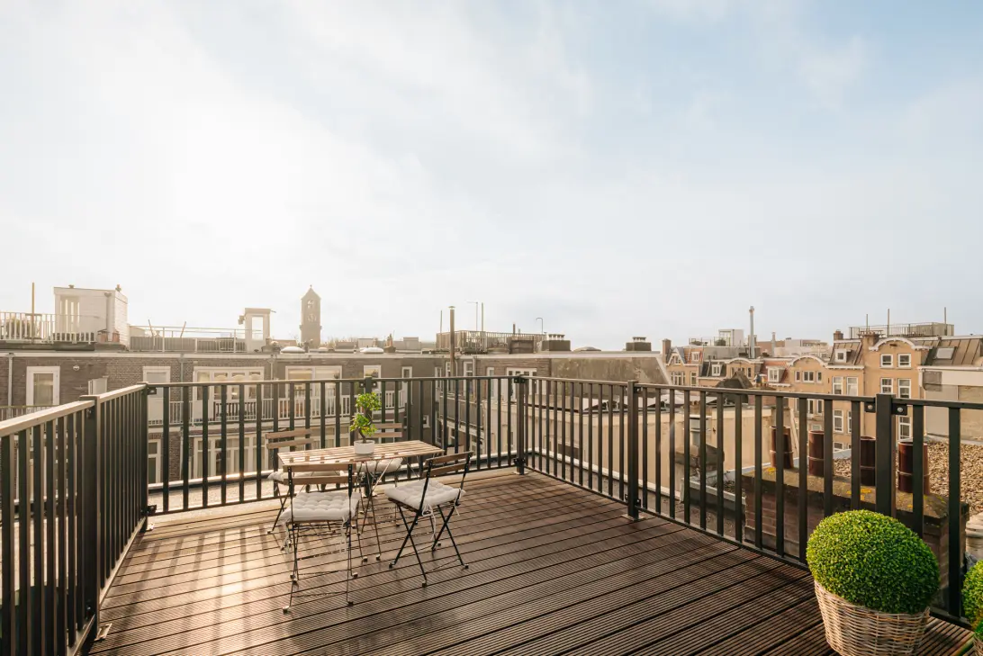 Vaste trap naar het riante dakterras van ca. 20 m2, hier geniet je de hele dag van de zon en een prachtig uitzicht over de stad.