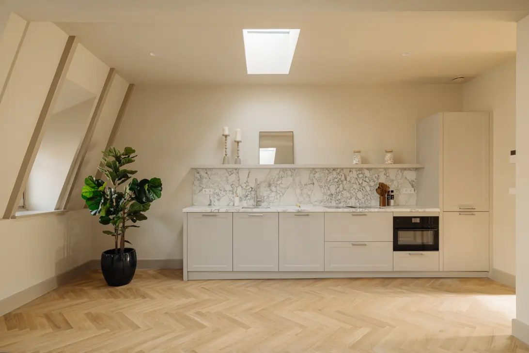 Through a well-maintained and fully renovated staircase, you reach the apartment on the second floor. The hallway leads to a private staircase to the third and top floor. The spacious landing provides access to all rooms. At the front, you’ll find the bright living room with an open kitchen. The luxurious kitchen is equipped with built-in appliances including a dishwasher, refrigerator, freezer, oven, induction cooktop with integrated extractor system (all from AEG), a Quooker tap, and a beautiful Italian Calacatta Gold marble countertop.