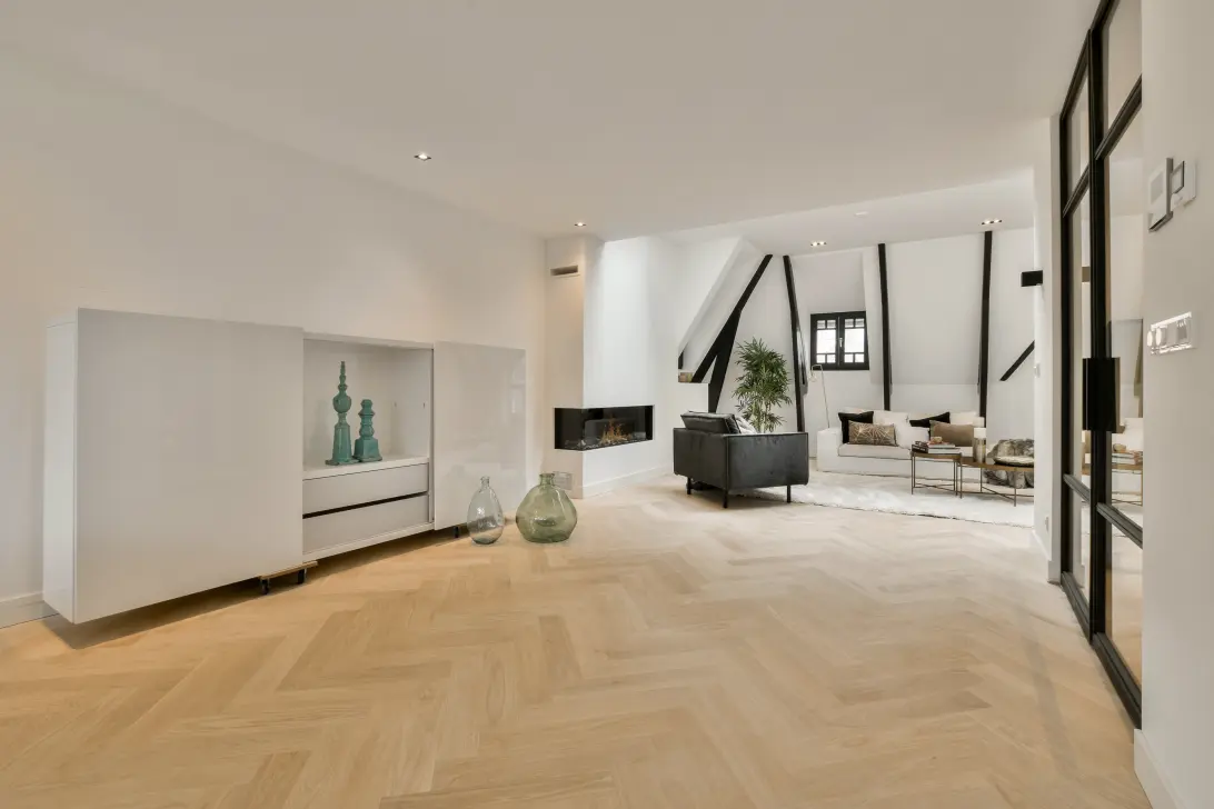 Het gehele appartement is voorzien van een prachtige houten vloer, in visgraat motief gelegd.