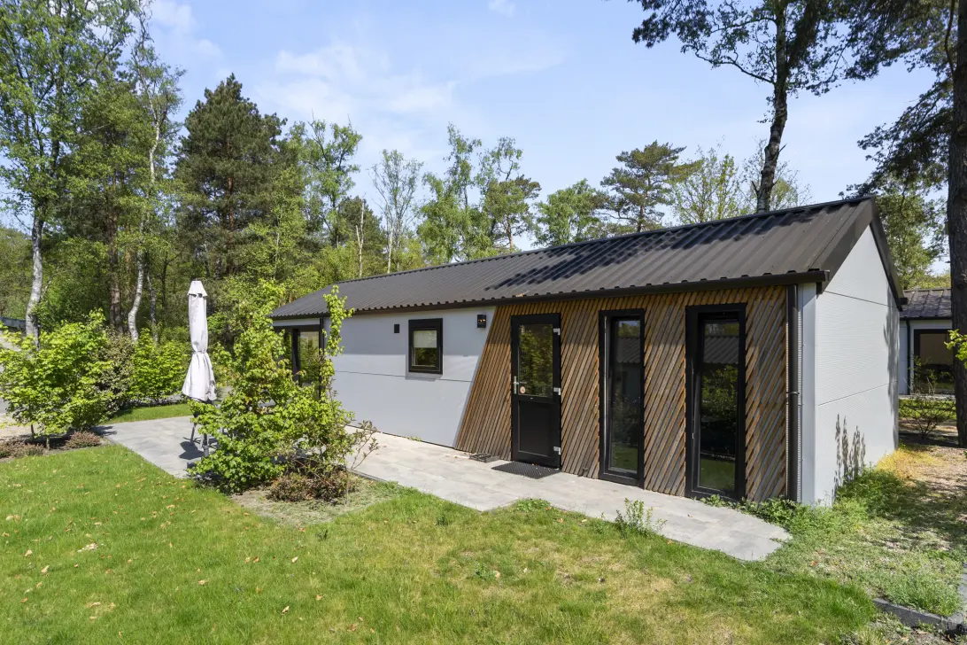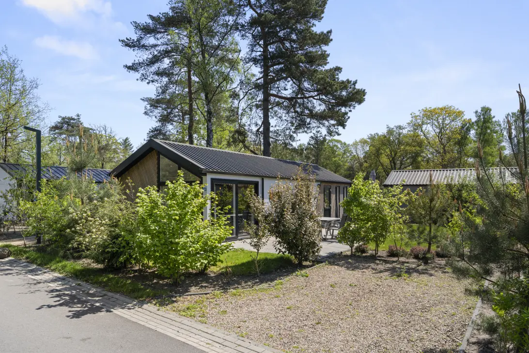 Een geweldige plek voor de natuurliefhebber! Dat is de beste omschrijving voor de groene en zonnige tuin die rondom het chalet ligt. Vanuit de leefruimte loop je zo het ruime terras op. Hier heb je veel plek om een heerlijke loungeset of een grote buitentafel te plaatsen. Op het terras geniet je in de ochtend van een lekker kopje koffie en de fluitende vogels en 's avonds van een gezellige borrel met vrienden. Daarnaast maakt de schitterende ligging aan de vijverpartij de locatie extra uniek. Vanaf je eigen tuin heb je via een brug toegang tot het eiland in het midden van de vijverpartij waar een speelgelegenheid is gerealiseerd wat vooral voor kinderen een geweldig avontuur biedt. Aan de voorzijde van het chalet heb je een eigen parkeerplaats voor de auto. Zo hoef je niet ver met de zware boodschappen of weekendtassen te lopen.