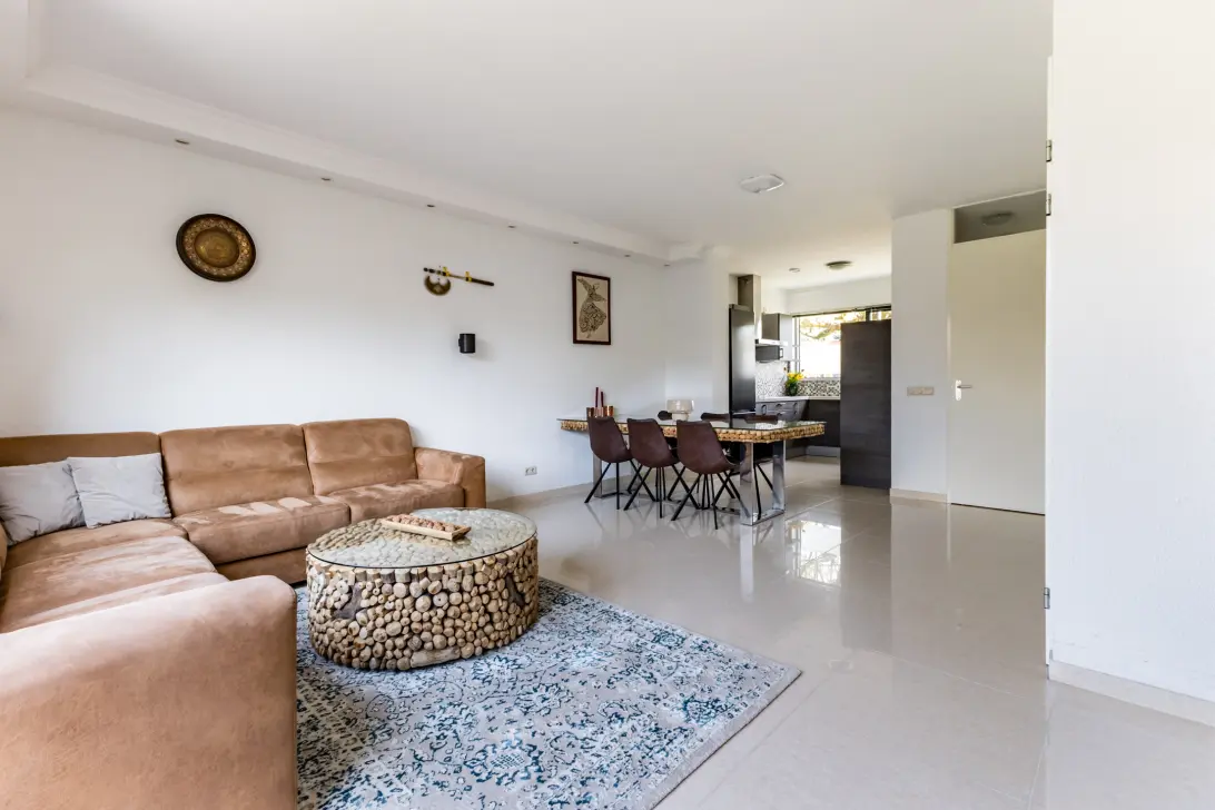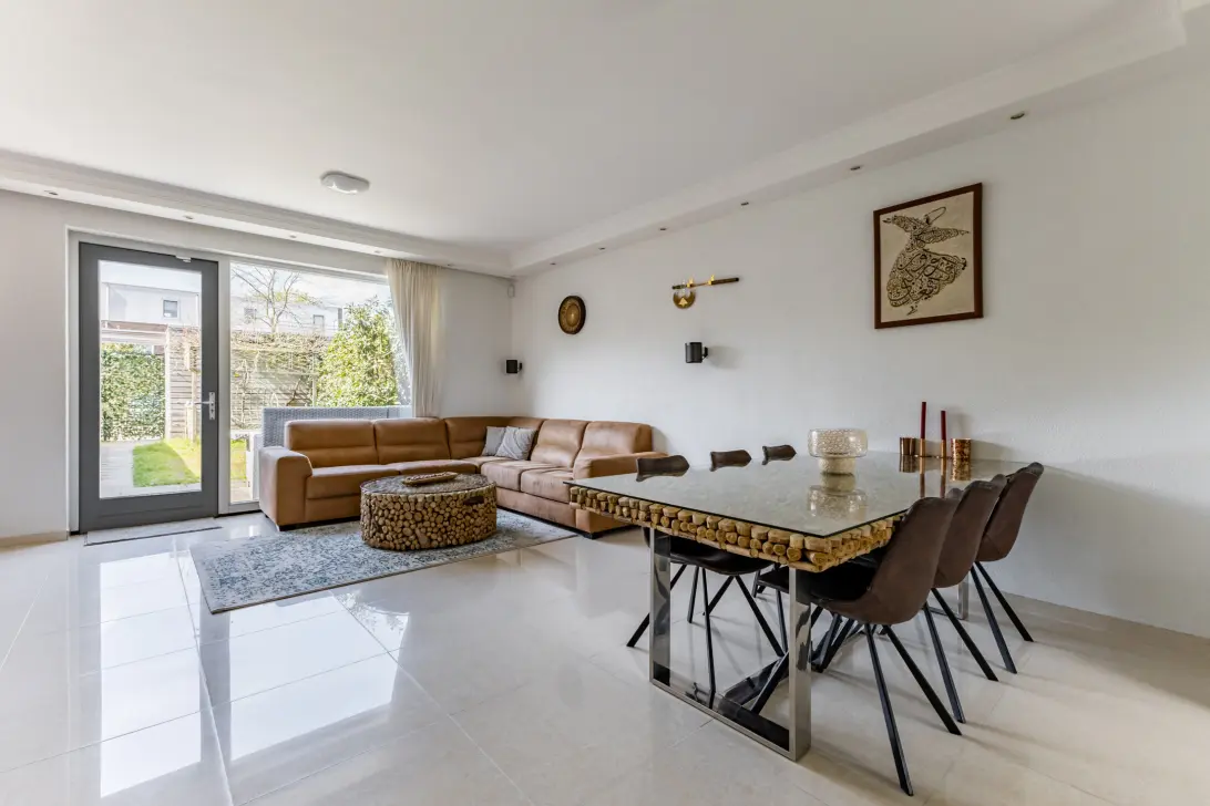Entree via de hal met meterkast, modern toilet en trapopgang. Vanuit de hal kom je in de ruime woonkamer met vloerverwarming en openslaande deuren naar de achtertuin. De woonkamer is licht, ruim (ca. 31m²) en biedt voldoende plek voor een grote eettafel en comfortabele zithoek. Aan de voorzijde bevindt zich de open keuken in L-opstelling, voorzien van composiet werkblad, vaatwasser, oven (2024) en koel-/vriescombinatie. Vanuit de keuken kijk je vrij uit over het groene plantsoen.