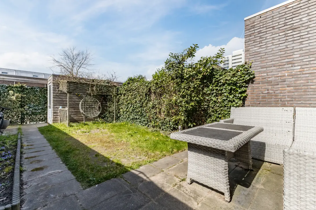 De fraai aangelegde achtertuin (ca. 10 meter diep en 4,8 meter breed) ligt op het westen en beschikt over een berging (ca. 6 m²) en een achterom.