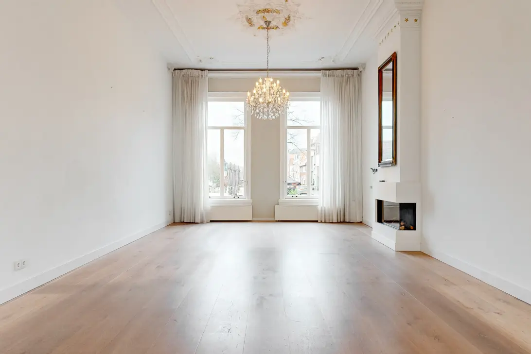 Indeling: beletage met circa 3,70 meter hoge plafonds met ornamenten. Ruime hal met trapopgang, fraai toilet met wandcloset, woonkamer met veel daglichttoetreding en tweemaal gashaard. Pleisterwerkwanden, open keuken met luxe witte hoogglans L-vormige unit en spoeleiland met inbouw wijnklimaatkast, elektrische oven, stoomoven, vaatwasser, 5 pits inductie Boretti fornuis, 90cm brede oven en Boretti koelkast/vriezer.