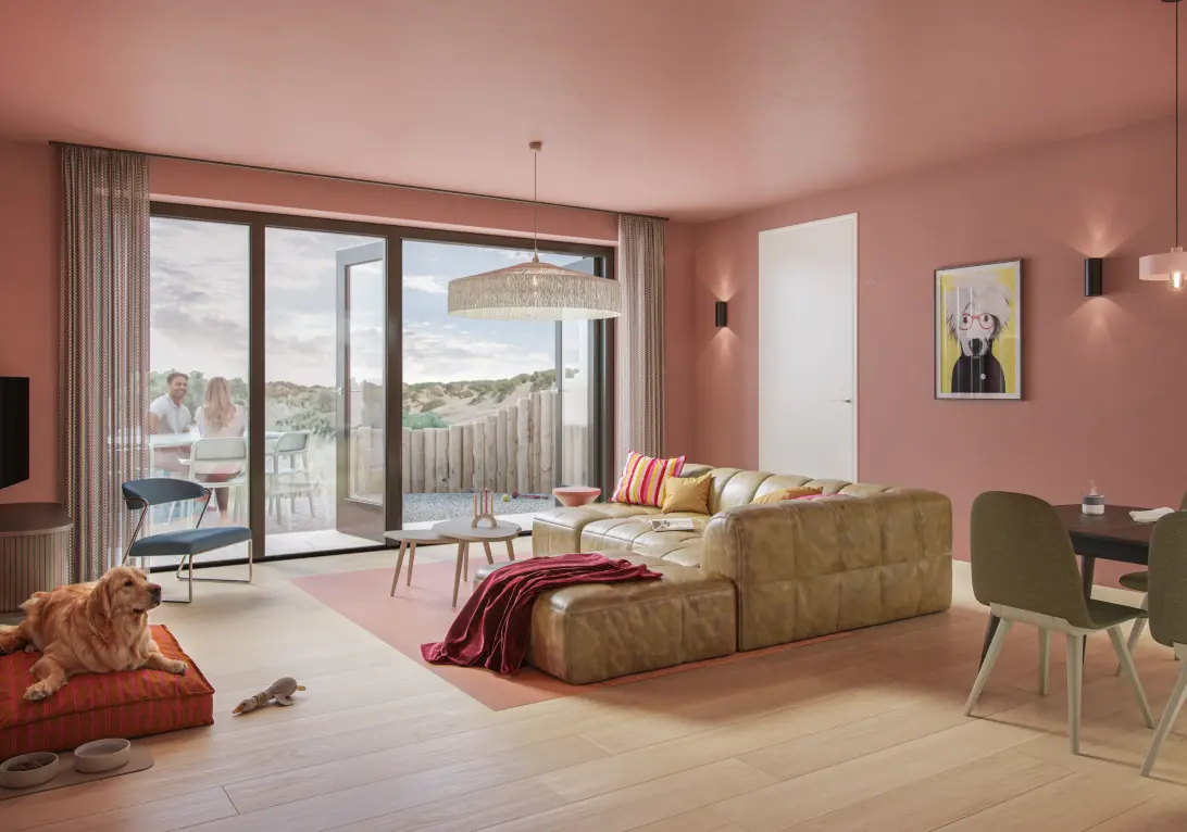 Duyn Suite 4-persoons Comfort dog (591.200 V.O.N) – speciaal ingericht voor gezinnen die hun trouwe viervoeter niet thuis willen laten. Deze variant is qua uiterlijk en indeling gelijk aan de standaard Duyn Suite 4-persoons Comfort, maar heeft een eigentijdse inrichting aangepast op het meebrengen van een huisdier. De buitenruimte is bovendien volledig omheind met kastanjepalen en voorzien van een afsluitbare poort op het terras, zodat de hond veilig kan verblijven zonder zelfstandig op ontdekking te gaan in het duin.
