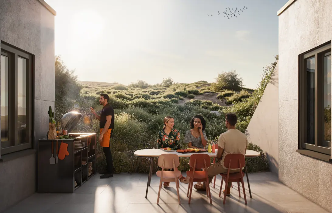 Via een grote glazen pui staat de keuken in directe verbinding met het terras, dat aan drie zijden wordt omsloten door de villa. Het duin fungeert als natuurlijke vierde gevel, waardoor een beschutte patio ontstaat die volledige rust en privacy biedt. De combinatie van betonlook en gebrand hout als gevelafwerking zorgt voor een ingetogen, chique uitstraling die perfect aansluit bij de natuurlijke omgeving.