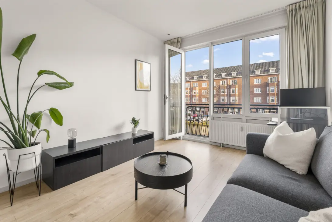 The apartment is situated in the monumental building “Oranjehof”, which was designed by an architect in 1942 in the Delft School architectural style. The building originally housed single working women, but today it is home to a diverse and pleasant mix of residents. The property enjoys a beautiful location directly on the Kostverlorenvaart canal.