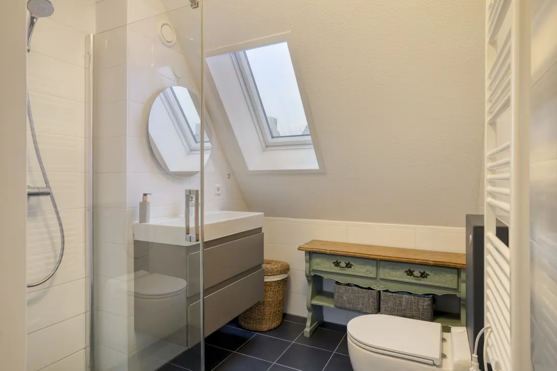 De nette, volledig betegelde badkamer is voorzien van een ruime douche, een tweede toilet en een wastafel. Een raam zorgt voor natuurlijke ventilatie zodat je altijd in een frisse omgeving start aan je dag.
