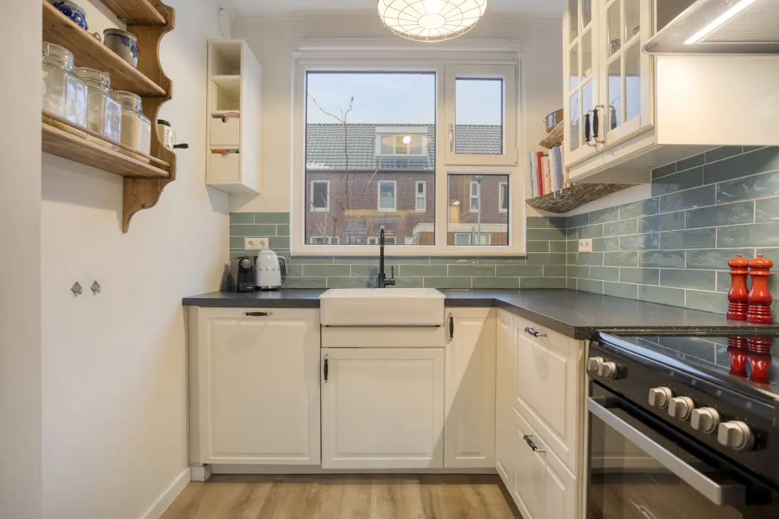 De keuken valt op door zijn landelijke afwerking en is ingericht in een praktische L-opstelling. Met een inductiekookplaat met oven, een losse koel-vriescombinatie en een vaatwasmachine sta jij binnen enkele minuten garant voor een heerlijke maaltijd – alles in een open en gezellige sfeer.