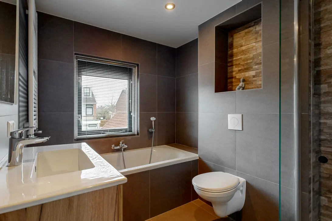 Eerste verdieping: 3 slaapkamers met rechte wanden en een nette laminaatvloer, ruime badkamer (voorheen slaapkamer) voorzien van ligbad, inloopdouche, wastafel in meubel en 2e toilet. Separate wasruimte (voorheen badkamer) met aansluiting voor de wasmachine en droger. Middels vlizotrap bereikbare stahoge bergvliering.